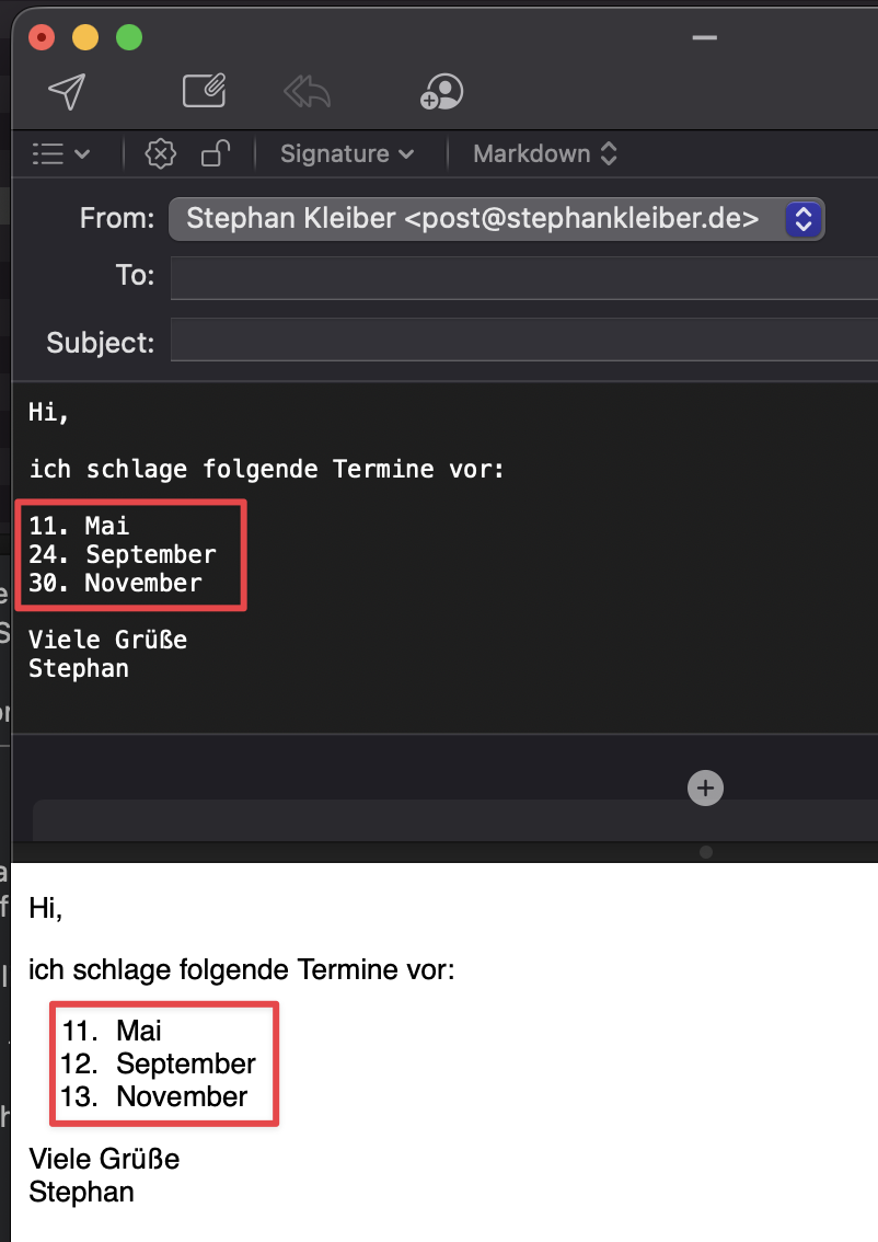 please see the attached screenshot for an example of what happens when I compose an email in MailMate and write down some dates line by line. The preview at the bottom of the compose window shows that the HTML part of the message contains different dates than those I’ve typed in.